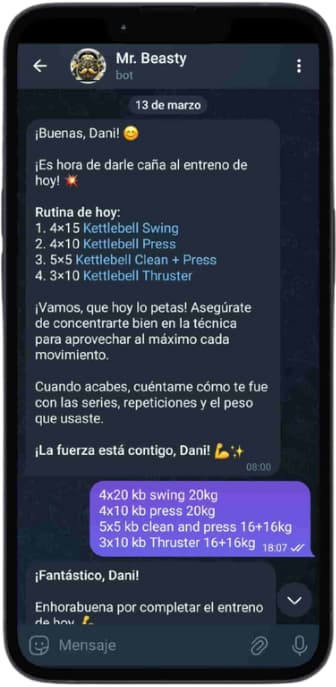 Cada mañana a las 7, Mr. Beasty te envía tu rutina diaria por Telegram.